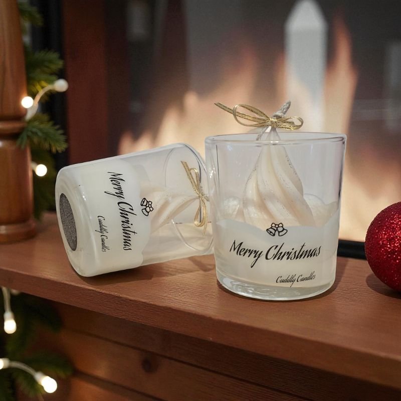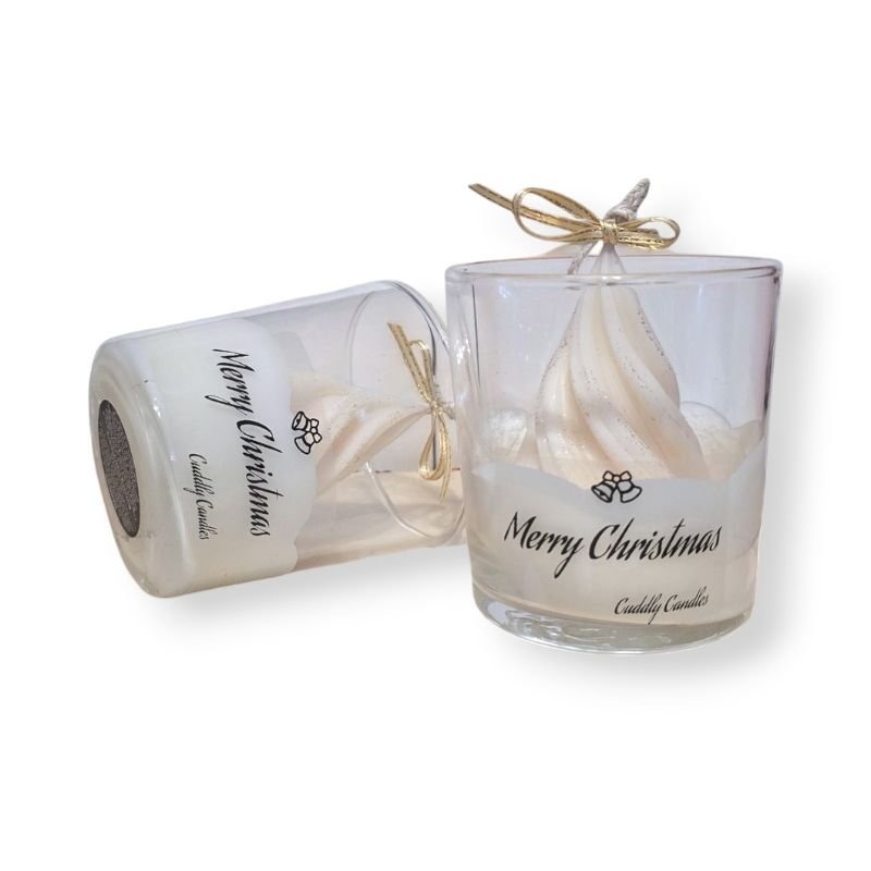 100% Φυτικό κερί σόγιας με 1 βαμβακερό φυτίλι σε γυάλινο ποτήρι με σαντιγί και Χριστουγεννιάτικο δέντρο, βιοδασπώμενο glitter και άρωμα Wood & Salt.