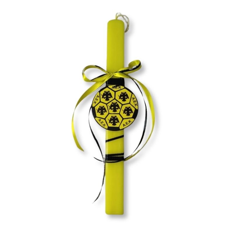 Κίτρινη πλακέ Λαμπάδα 30εκ, με ξύλινη κιτρινόμαυρη διακοσμητική μπάλα Α.Ε.Κ. και δικέφαλους 8 εκ.