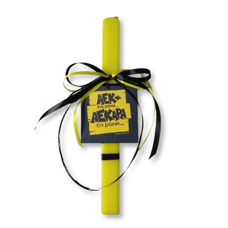 Κίτρινη λαμπάδα 30 εκ, με ξύλινο διακοσμητικό ΑΕΚ στα εύκολα ΑΕΚΑΡΑ στα δύσκολα (10 εκ.).