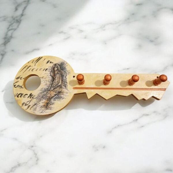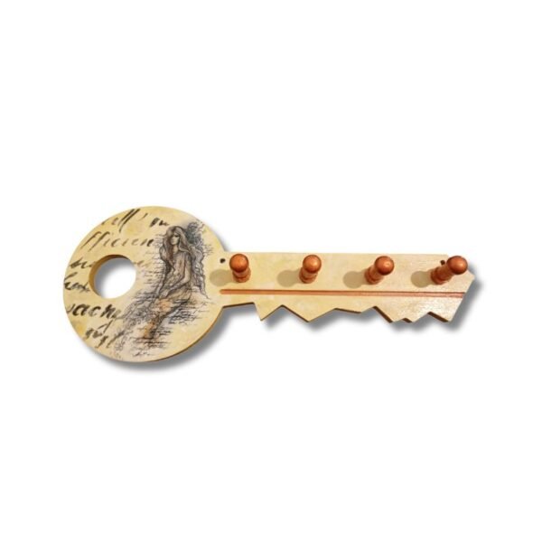 Κλειδοθήκη ξύλινη σε σχήμα κλειδιού, φτιαγμένη με τεχνική decoupage και προσεγμένες λεπτομέρειες που της δίνουν μοναδικό χαρακτήρα.
