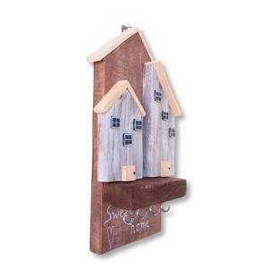 Χειροποίητη ξύλινη κλειδοθήκη σε σχήμα σπιτιού με μέσα δύο μικρότερα σπιτάκια σε αποχρώσεις του καφέ και άσπρου.