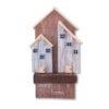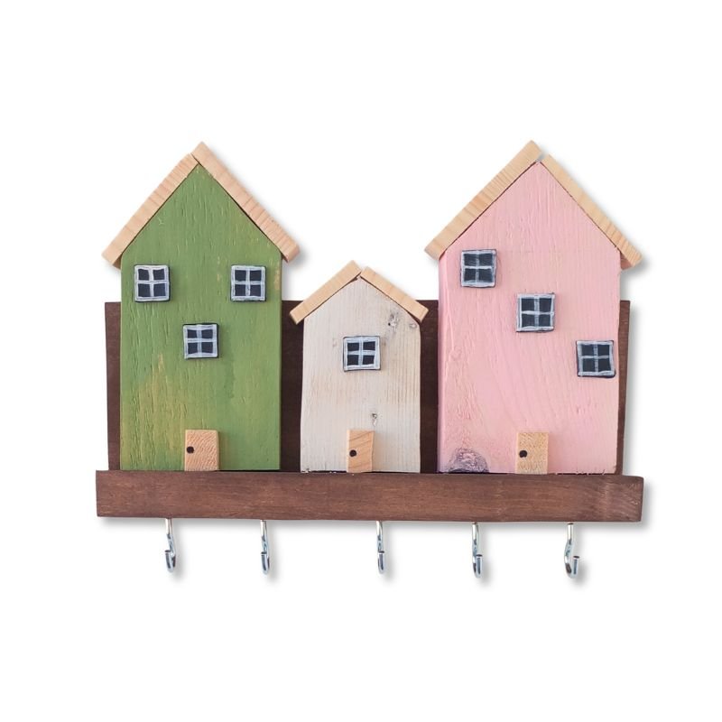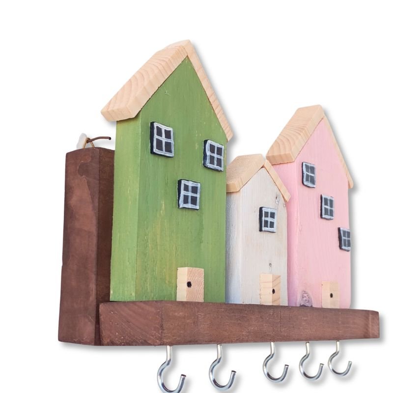 Κλειδοθήκη ξύλινη με τρία σπιτάκια σε παστέλ αποχρώσεις.