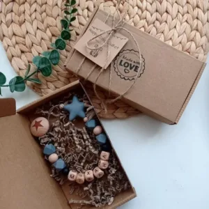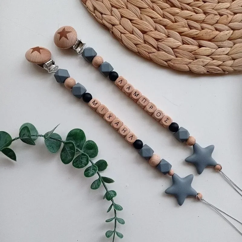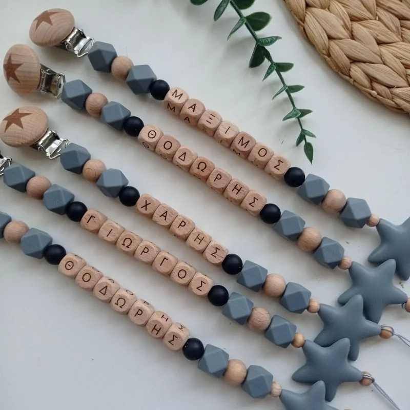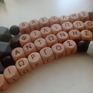 Το ονοματάκι χαράζεται με λέιζερ σε ξύλινες χαντρούλες και συνδυάζεται με μασητικές χάντρες σιλικόνης.