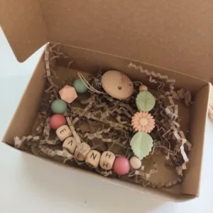 Δωράκι που αγαπήθηκε πολύ! Ιδανικό για βάπτιση, babyshower και καλωσόρισμα μωρού. Το ονοματάκι χαράζεται με λέιζερ σε ξύλινες χαντρούλες και συνδυάζεται με μασητικές χάντρες σιλικόνης.