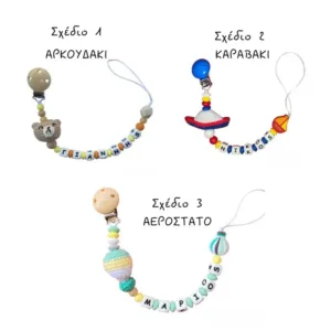 Προσωποποιημένα, πωτότυπα και πρακτικά τα κλιπ πιπίλας διατηρούν την πιπίλα κοντά στο μωράκι σας, δεν τη χάνετε, δεν την ψάχνετε. Οι μασητικές χάντρες σιλικόνης που σχηματίζουν το όνομα του μωρού σας, μπορούν να ανακουφίσουν τα δοντάκια του. Παράλληλα έχουν πλεκτή φιγούρα της επιλογής σας, σε καραβάκι ή αερόστατο.