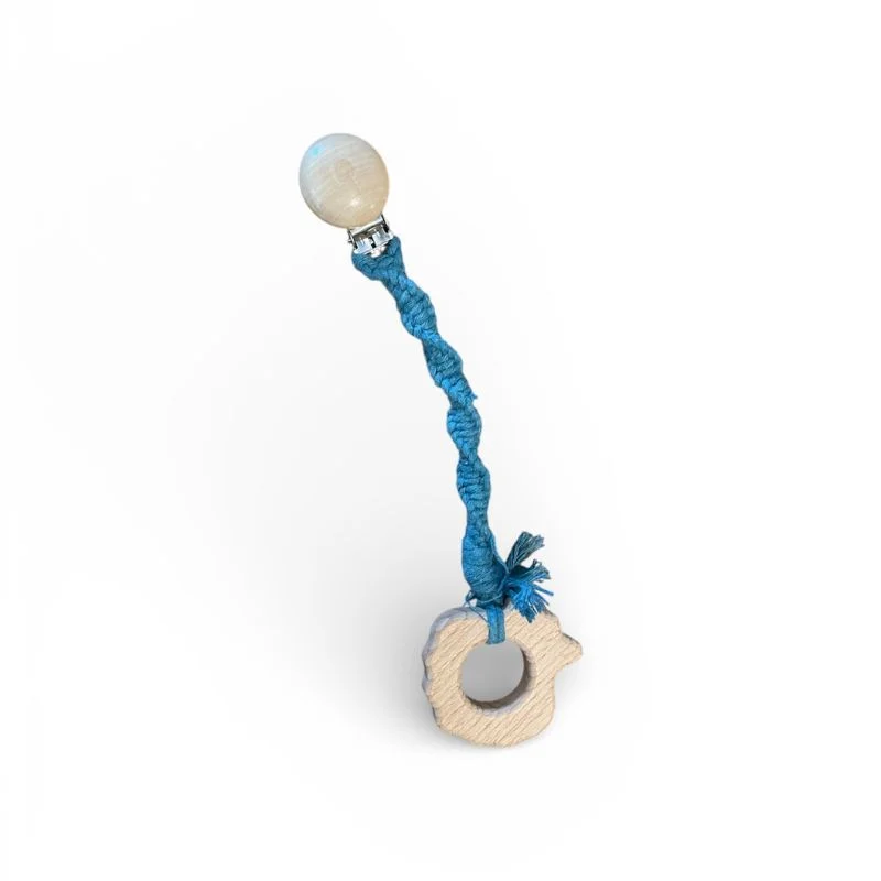 Κλιπ πιπίλας φτιαγμένο από 100% βαμβακερό νήμα μακραμέ χρώματος σάπιο μήλο ή μπλε και ξύλινη λεπτομέρεια στο κλιπ.
