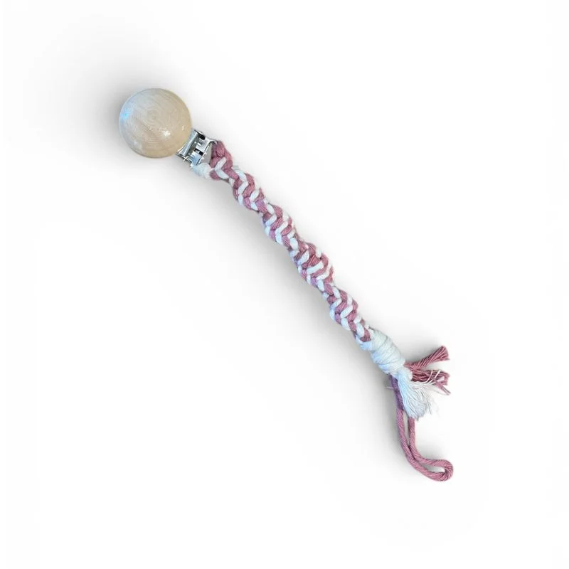 Κλιπ πιπίλας φτιαγμένο από 100% βαμβακερό νήμα μακραμέ χρώματος σάπιο μήλο, λευκό ή twist (σάπιο μήλο και λευκό) και ξύλινη λεπτομέρεια στο κλιπ.