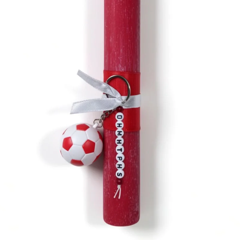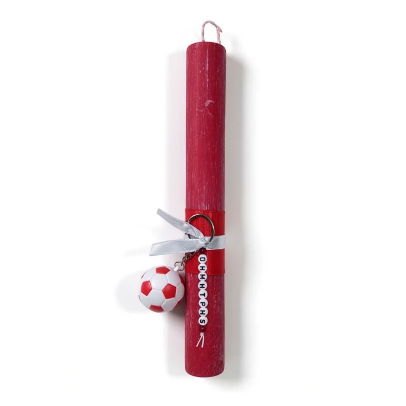Είσαι Ολυμπιακός; Κόκκινη λαμπάδα με κόκκινη και λευκή κορδέλα, μπρελόκ με κόκκινη μπάλα ποδοσφαίρου και το όνομα του παραλήπτη (λατινικοί χαρακτήρες).