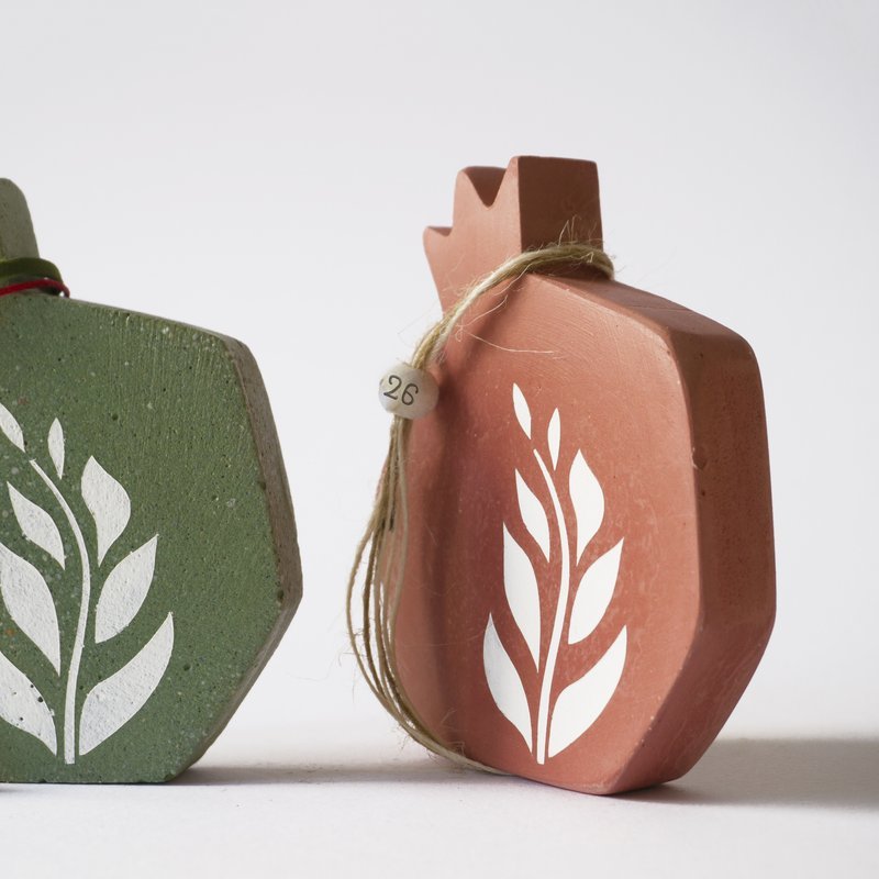 Είναι φτιαγμένο από τσιμέντο και ζωγραφισμένο στο χέρι. Διακοσμείται με φυσικό κορδόνι γιούτα και ξύλινο στοιχείο με τον αριθμό 26.
