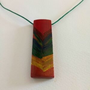 Κολιέ από ξύλο σε κόκκινο σκούρο-μπορντό, πολύχρωμο, ζωγραφισμένο στο χέρι. Κρέμεται από αυξομειούμενο κορδόνι σε πράσινο χρώμα.