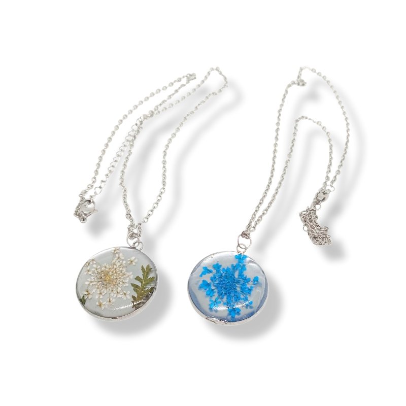 Κολιέ με υγρό γυαλί με αποξηραμένα λουλούδια και ατσάλινα στοιχεία. Ένα δώρο για όλες τις ώρες.