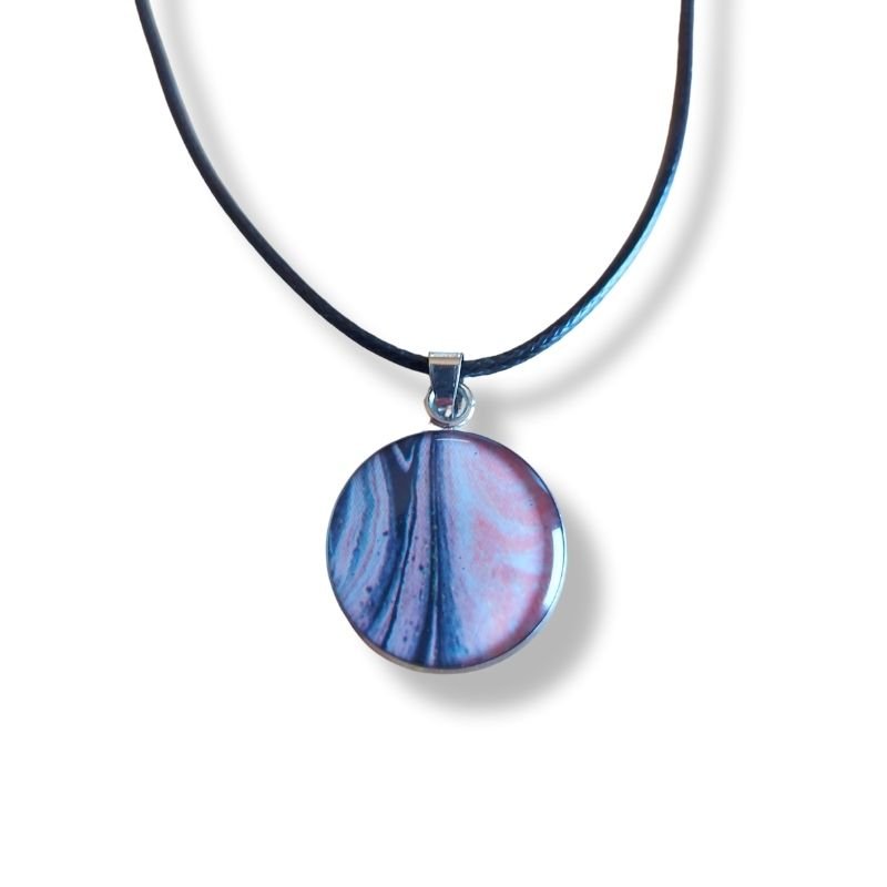 Κολιέ με μενταγιόν από υγρό γυαλί με “νερά” και χρωματισμούς σε ροζ και μπλε σκούρο.