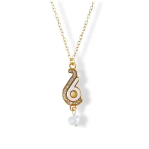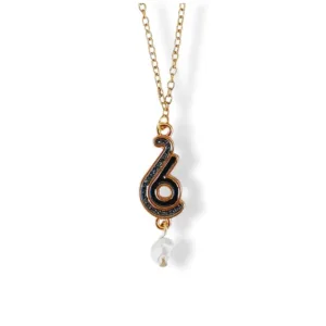 Κολιέ από ατσάλινη αλυσίδα με επίχρυσο γούρι 26 glitter σμάλτο με μπαρόκ μαργαριτάρι.