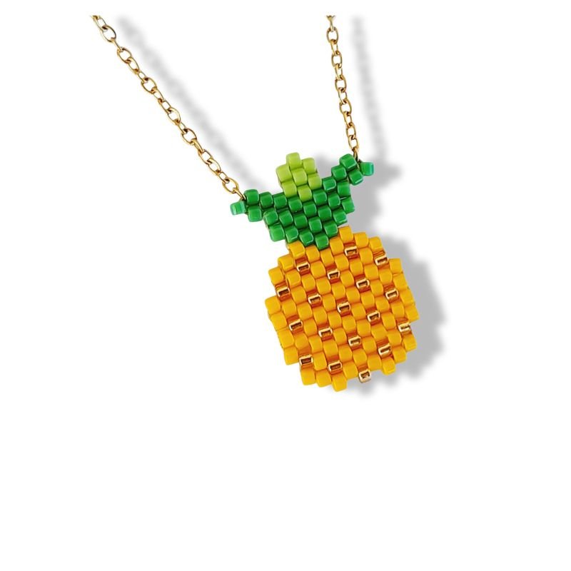 Χειροποίητο κολιέ από ατσάλινη αλυσίδα με ανανά σε κίτρινο χρώμα με την τεχνική του miyuki.