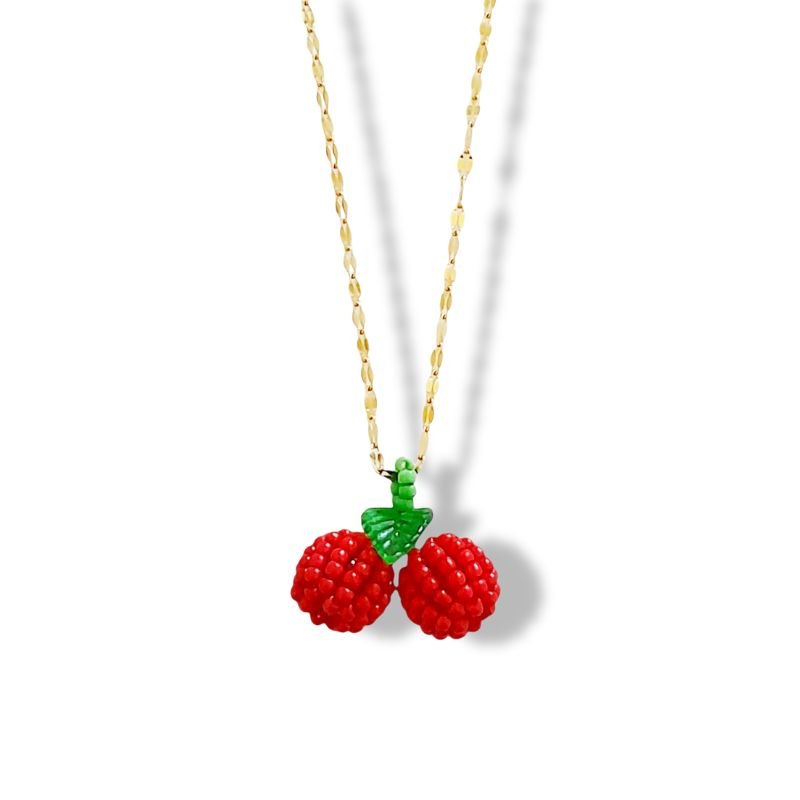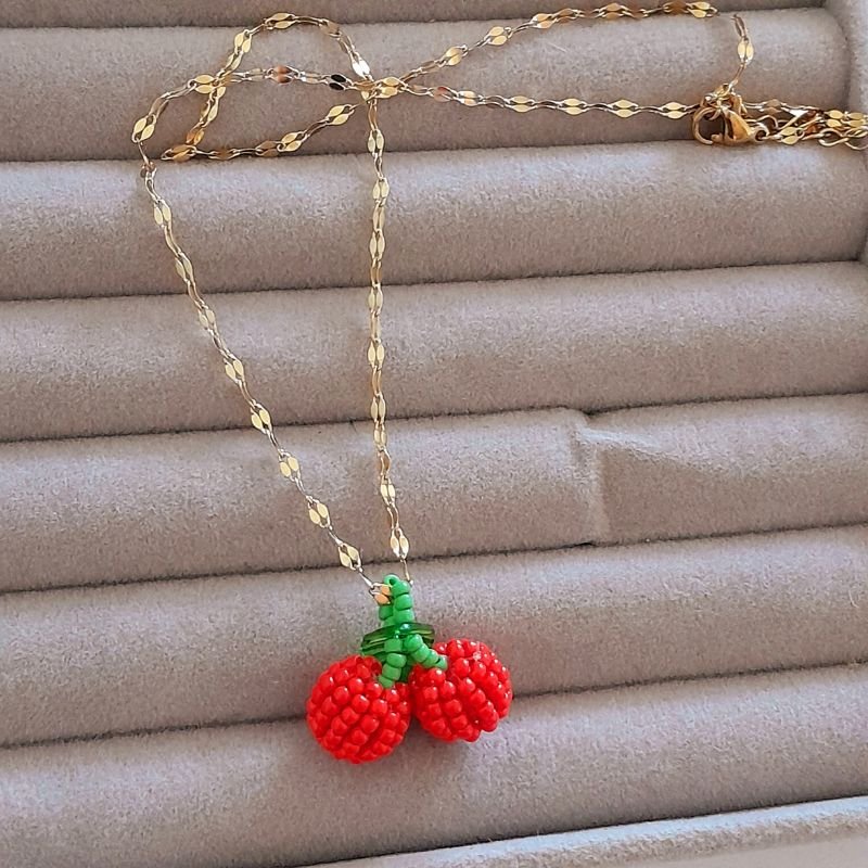 Χειροποίητο κολιέ από ατσάλινη αλυσίδα με κερασάκια από χαντρούλες miyuki.