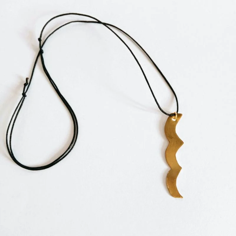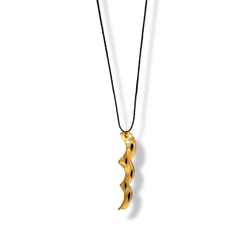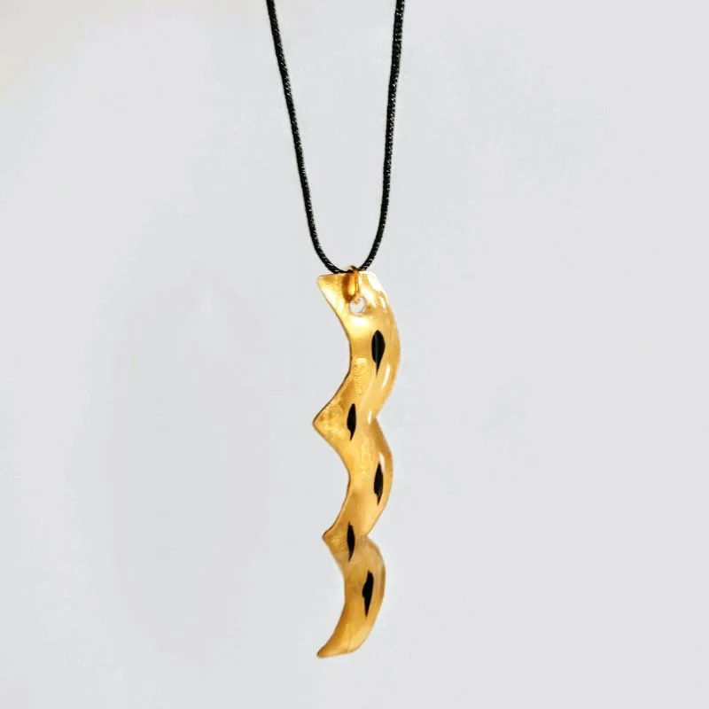 Κολιέ, μακρύ, από ορείχαλκο και επικαλυμμένο με υγρό γυαλί, ζωγραφισμένο και διαμορφωμένο στο χέρι, σε χρυσό-μαύρο. Το κορδόνι του είναι μαύρο και αυξομειώνεται.