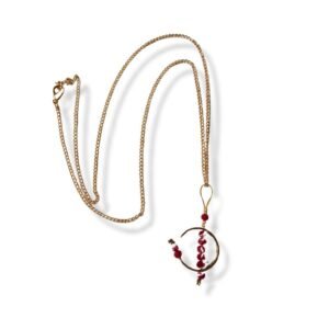 Κολιέ, με μεταλλικό ατσάλινο στοιχείο σε χρυσό χρώμα, κρύσταλλα σε κόκκινο σκούρο και αλυσίδα μπρούτζινη σε χρυσό χρώμα.