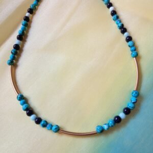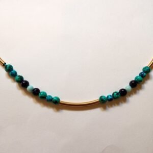 Κολιέ που αποπνέει ηρεμία και κομψότητα. Οι φυσικές αποχρώσεις του μπλε και του γαλάζιου στον χαολίτη θυμίζουν θάλασσα και ουρανό, με μοναδικά “νερά” που κάνουν κάθε πέτρα ξεχωριστή. Τα ατσάλινα σωληνάκια σε χρυσαφί απόχρωση προσθέτουν μια διακριτική λάμψη.