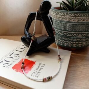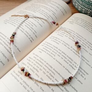 Κολιέ με λευκές γυάλινες κοντερίες και τσιπς τουρμαλίνη.