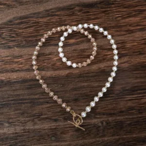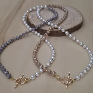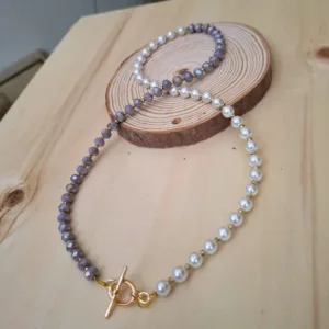 Χειροποίητα κολιέ με λευκή πέρλα από φίλντισι, κρύσταλλα σε διάφορα χρώματα, το ένα στο χρώμα της καραμέλας και το άλλο σε λιλά εναλλάξ με πολύ μικρά κρυσταλάκια σε φωτεινό χρυσό με κούμπωμα στο μπροστινό μέρος.