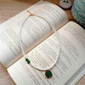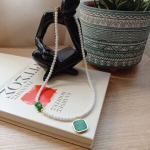 Κολιέ με λευκές πέτρες, πράσινα τσιπς κοχυλιού, αιματίτη και ατσάλινο στοιχείο.
