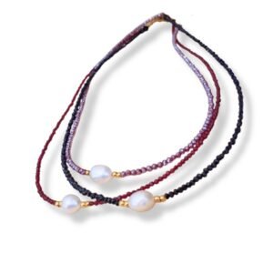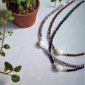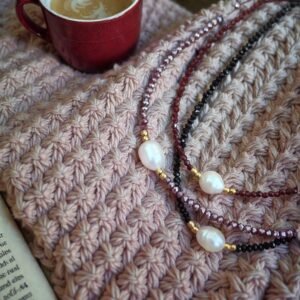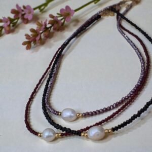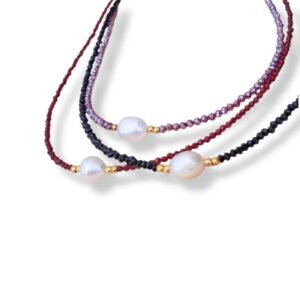 Χειροποίητα κολιέ σε μαύρο ή σε σκούρο κόκκινο ή σε μωβ-βισσινί κρυσταλλάκια με ένα υπέροχο μαργαριτάρι καλλιέργειας στο κέντρο. Ένα υπέροχο και στυλάτο κόσμημα που ταιριάζει με όλες τις εμφανίσεις. Γεμάτο αρχοντιά.