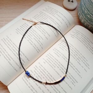 Κολιέ με μαύρες γυάλινες κοντερίες, χαολίτη, αιματίτη και ατσάλινο στοιχείο.