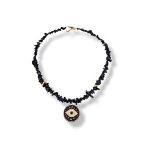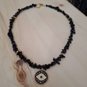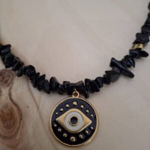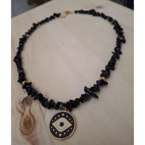 Χειροποίητο κολιέ με μαύρη πέτρα και αιματίτη κάνουν παρέα. Μαζί με ένα ατσάλινο χρυσό και μαύρο μάτι με σμάλτο.