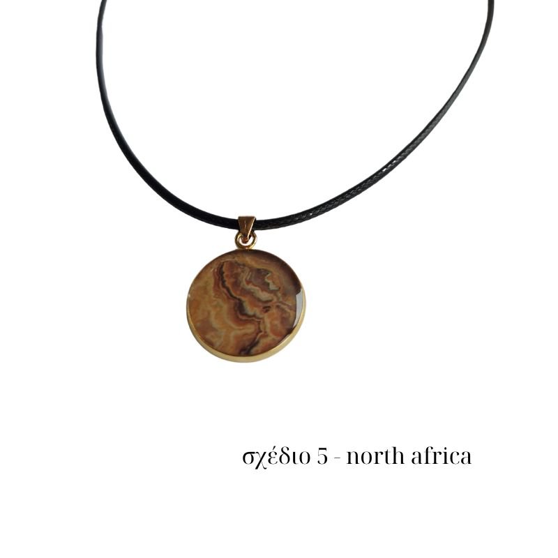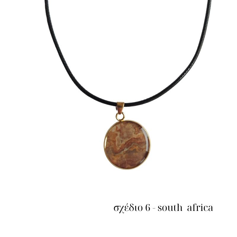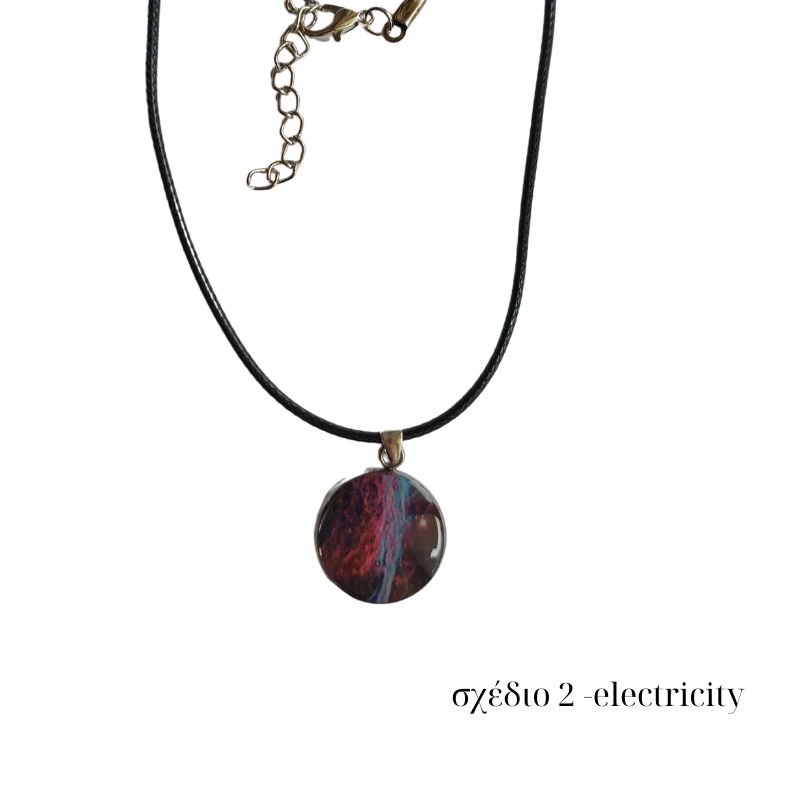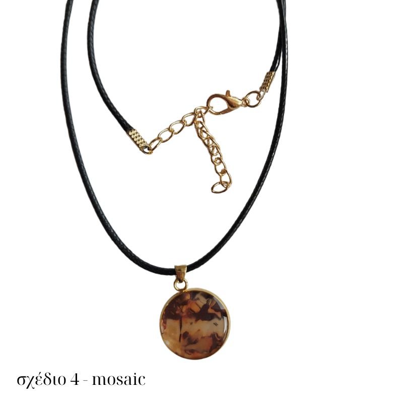 Κολιέ με μενταγιόν κατασκευασμένα από υγρό γυαλί και διάφορα σχέδια σε αποχρώσεις του καφέ και του μπλε – μωβ. Συνοδεύονται με μαύρο λουράκι που αυξομειώνει.