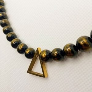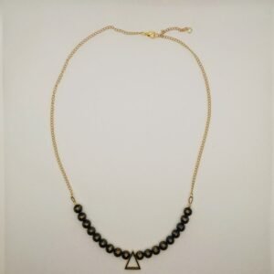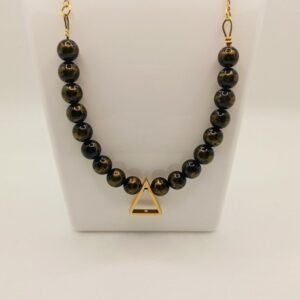 Κολιέ, με ημιπολύτιμες πέτρες νεφρίτη, σε μαύρο με χρυσό, ατσάλινο τρίγωνο και ατσάλινη αλυσίδα, σε χρυσαφί χρώμα.
