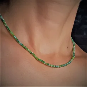 Minimal κολιέ με μονή σειρά από κρυσταλλάκια σε τόνους του πράσινου 3mm. Μήκος 45εκ με προέκταση ως 50 εκ. Φοριέται μόνο του ή σε συνδυασμό με άλλα κοσμήματα.