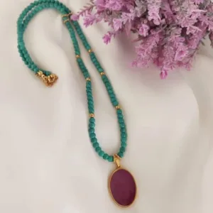 Κολιέ με τυρκουάζ χάντρες και μεταλλικό χρυσό στοιχείο οβάλ χρωματισμένο με υγρό γυαλί σε φούξια απόχρωση.