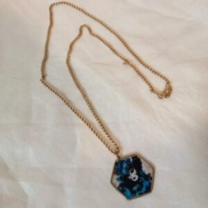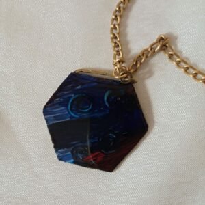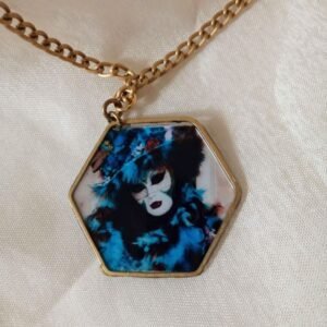 Κολιέ, εξάγωνο, μπρούτζινο. Έχει δύο όψεις. Η μια με απεικόνιση βενετσιάνικης καρναβαλικής μορφής και η άλλη ζωγραφισμένη στο χέρι, σε αποχρώσεις του μπλε, επικαλυμμένες με υγρό γυαλί. Κρέμεται από μπρονζέ αλυσίδα αλουμινίου, με κούμπωμα για να ρυθμίζετε το ύψος στο σημείο που θέλετε.
