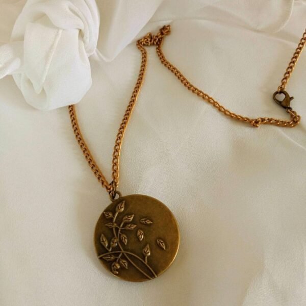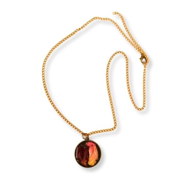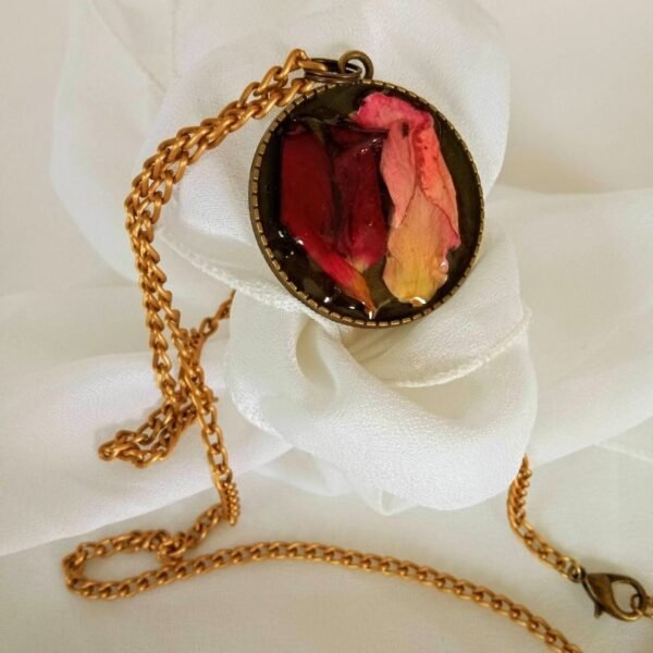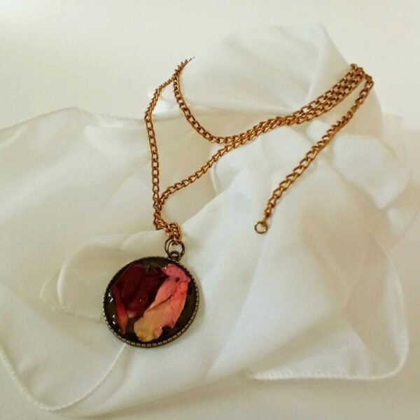 Γυναικείο χειροποίητο κολιέ σε στύλ vintage, με αποξηραμένα πέταλα από κόκκινα και ροζ τριαντάφυλλα, επικαλυμμένα με υγρό γυαλί, σε μπρονζέ αντικέ στρογγυλό πλαίσιο. Κρέμεται από μπρονζέ αντικέ αλυσίδα με κούμπωμα και κρικάκι για πιο κοντό. Είναι διπλής όψης. Η πίσω όψη του είναι διακοσμημένη με φύλλα.