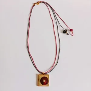Κολιέ τετράγωνο με υγρό γυαλί. Κρέμεται από κορδόνια σε μαύρο και κόκκινο με διακοσμητικές πέτρες σε μαύρο και κόκκινο.