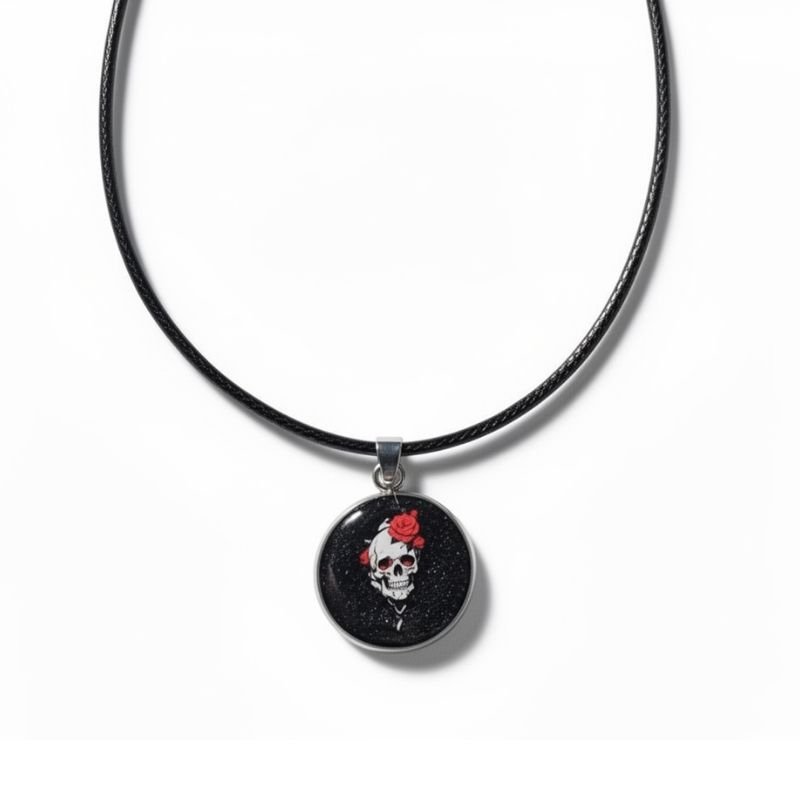 Κολιέ Rosa Mortis (ρόδο του θανάτου) – Κολιέ από υγρό γυαλί, με μαύρο φόντο και ελαφρώς glitter στο εσωτερικό του, ενώ στο κέντρο κυριαρχεί η νεκροκεφαλή με έντονο κόκκινο τριαντάφυλλο επάνω.