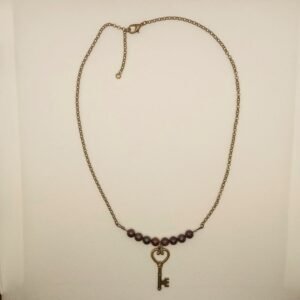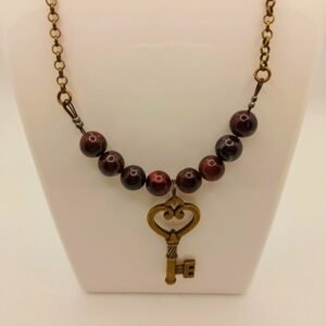 Χειροποίητο κολιέ, με ημιπολύτιμες πέτρες “μάτι της τίγρης”, σε καφέ αποχρώσεις και μπρούτζινο κλειδί και αλυσίδα.