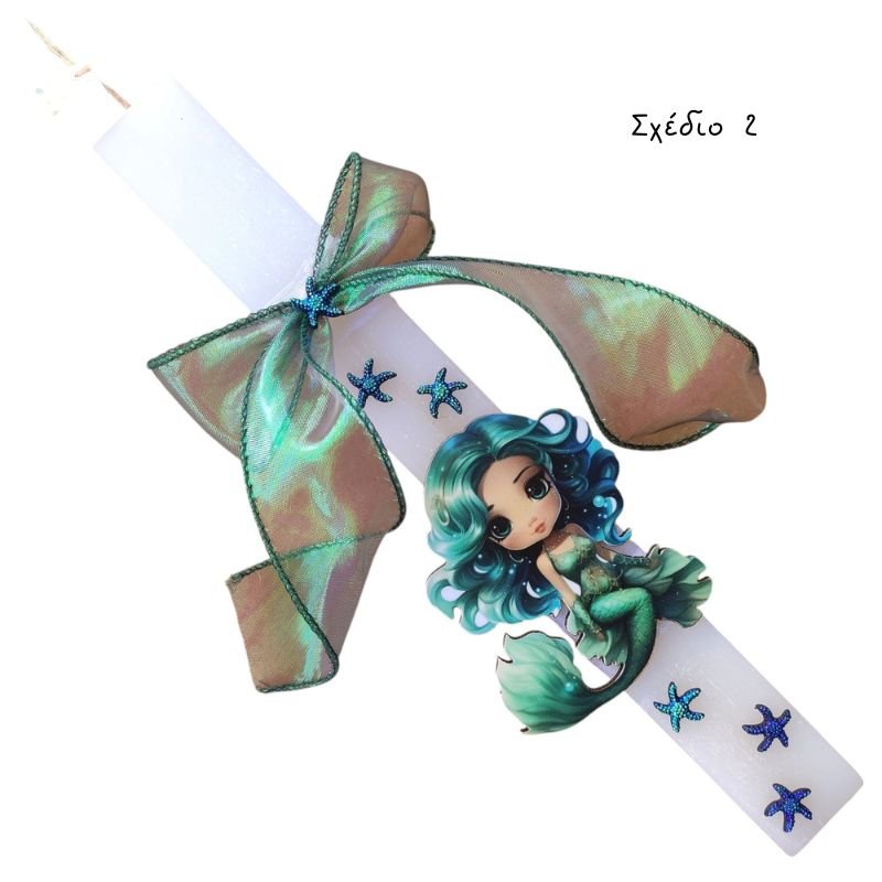 Πασχαλινή χειροποίητη Λαμπάδα για κορίτσια, 25 εκ, στολισμένη κορδέλες και ξύλινο διακοσμητικό γοργόνα. Θα τη λάβετε σε συσκευασία δώρου ασορτί στολισμένη.