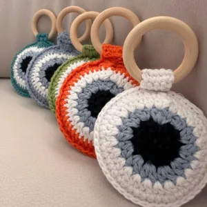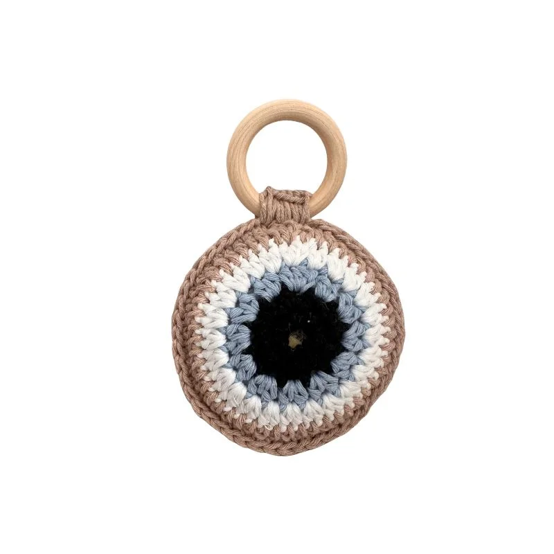 Κάθε μωράκι αξίζει ένα ξεχωριστό πρώτο παιχνίδι! Αυτή η χειροποίητη πλεκτή κουδουνίστρα συνδυάζει την παράδοση του προστατευτικού ματιού με τη ζεστασιά και την ασφάλεια που θέλουμε για τα μικρά μας. Κάθε κομμάτι φτιάχνεται με υπομονή και αγάπη, για να γίνει ο πιο γλυκός σύντροφος του μωρού σου.