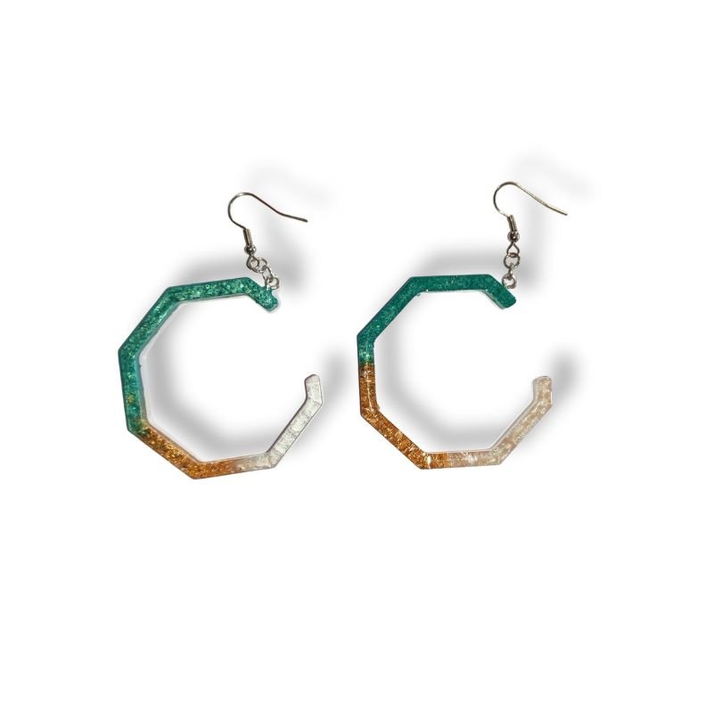 Κρεμαστά σκουλαρίκια από υγρό γυαλί εξαγωνικά σε πράσινο, χρυσό και λευκό.