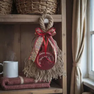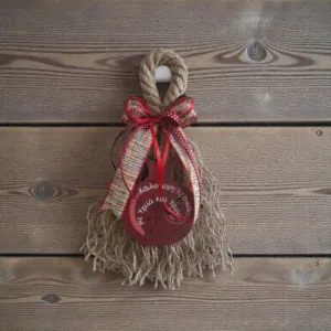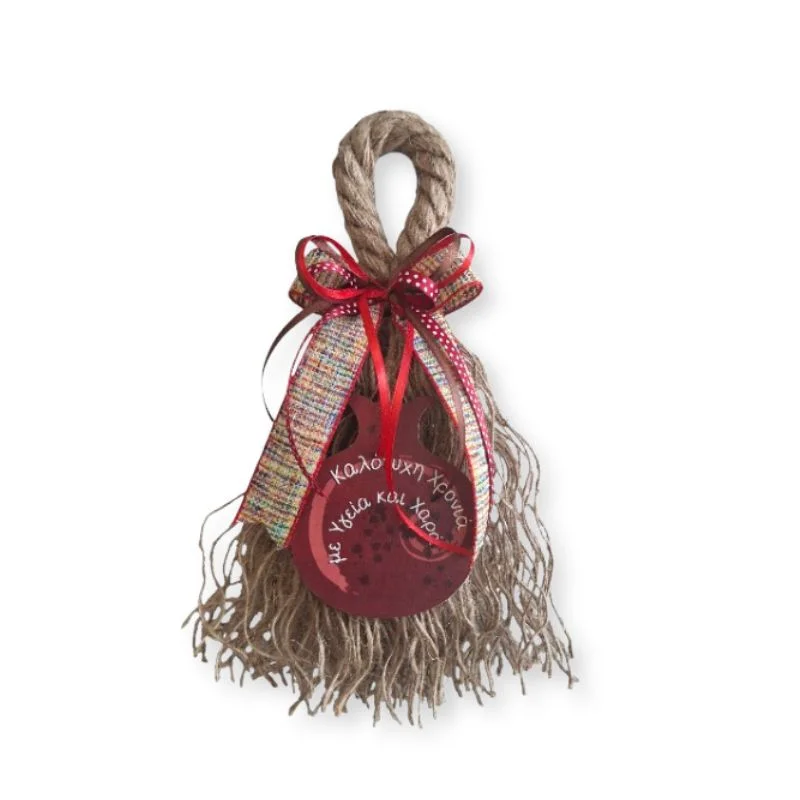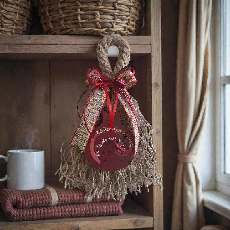 Ένα πανέμορφο και μοναδικό  με ένα μεγάλο ξύλινο ρόδι “για το καλό” Είναι δεμένο πάνω σε φυσικό στριφτό κορδόνι με κορδέλες.