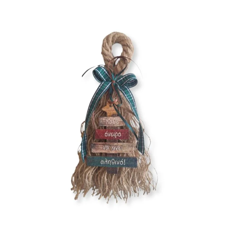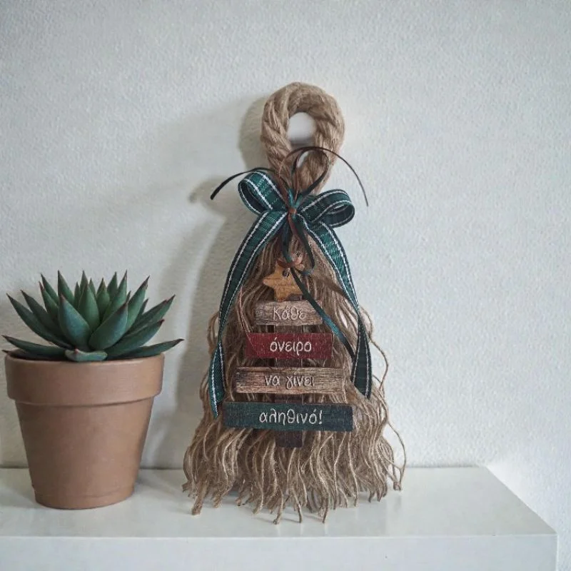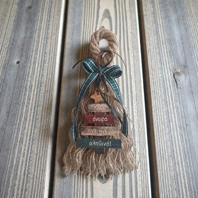 Ένα πανέμορφο και μοναδικό κρεμαστό γούρι-στολίδι με ένα υπέροχο ξύλινο δέντρο με ευχές για όλους. Είναι δεμένο πάνω σε φυσικό στριφτό κορδόνι με κορδέλες.