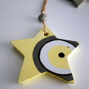 Κρεμαστό γούρι – φυλαχτό, με στοιχεία ( δύο αστέρια και μία σφαίρα) φτιαγμένα από χρωματιστό / κίτρινο και γκρι τσιμέντο, ζωγραφισμένα στο χέρι και περασμένα με ακρυλικό οικολογικό βερνίκι.