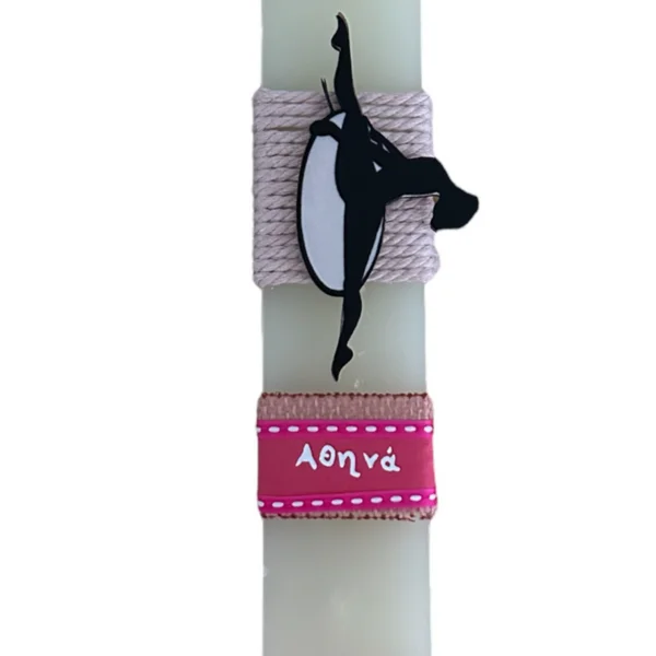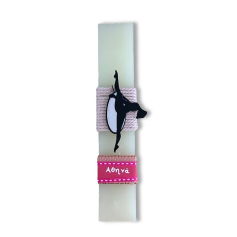 Εκρού αρωματική λαμπάδα 25 εκατοστά με εντυπωσιακό ξύλινο στοιχείο Aerial Sports με όνομα. Η λαμπάδα έχει υπέροχο άρωμα.