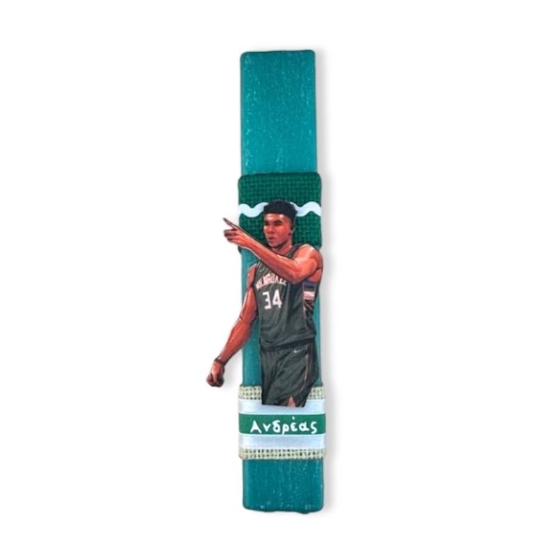 Πράσινη ξυστή αρωματική λαμπάδα 23 εκατοστά με εντυπωσιακό ξύλινο στοιχείο Αντετοκούμπο, για τους λάτρεις του μπάσκετ.