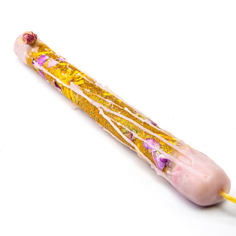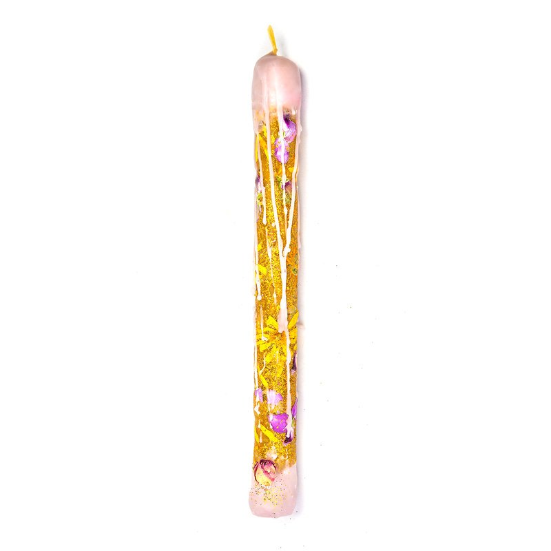 Μοναδική, χειροποίητη λαμπάδα από αγνό, ακατέργαστο, φυσικό κερί μέλισσας με πολύχρωμη, χαρούμενη, ανοιξιάτικη ροζ διάθεση! Διακοσμημένη με μαργαρίτες, ροδοπέταλα κι άλλα αποξηραμένα άνθη και λεπτομέρειες από χρυσόσκονη. Για τους λάτρεις του φυσικού στοιχείου που το μοναδικό άρωμα του μελιού και της πρόπολης θα τους χαλαρώσει απόλυτα.
