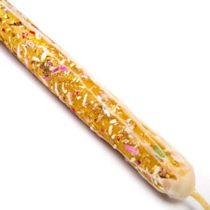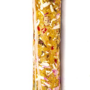 Λαμπάδα από αγνό, ακατέργαστο, φυσικό κερί μέλισσας σε φυσικό χρώμα με λευκή κέρινη λεπτομέρεια κι αποξηραμένα, πολύχρωμα πέταλα λουλουδιών κ χρυσόσκονης σε όλη την επιφάνειά της. Λαμπερή, χρωματιστή και φυσικά αρωματισμένη από μέλι και πρόπολη, φέρνει τη χαρά όλης της  Άνοιξης στα χέρια σας!