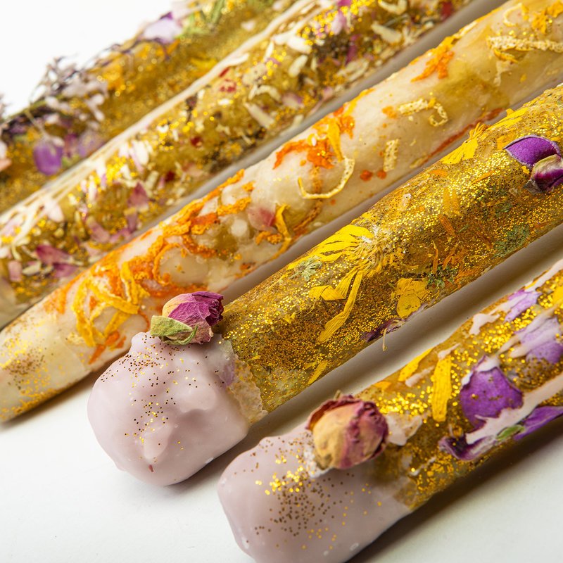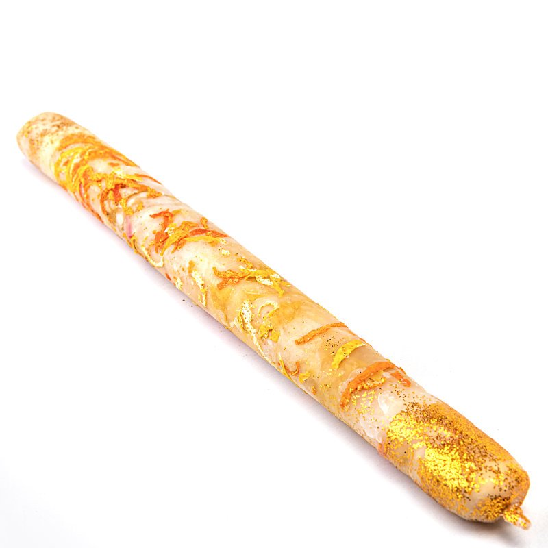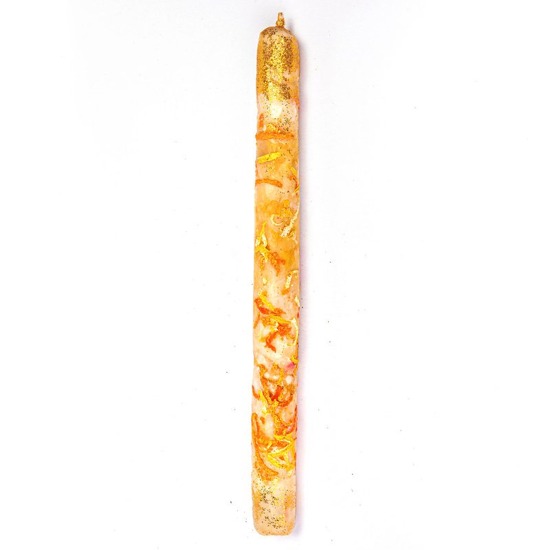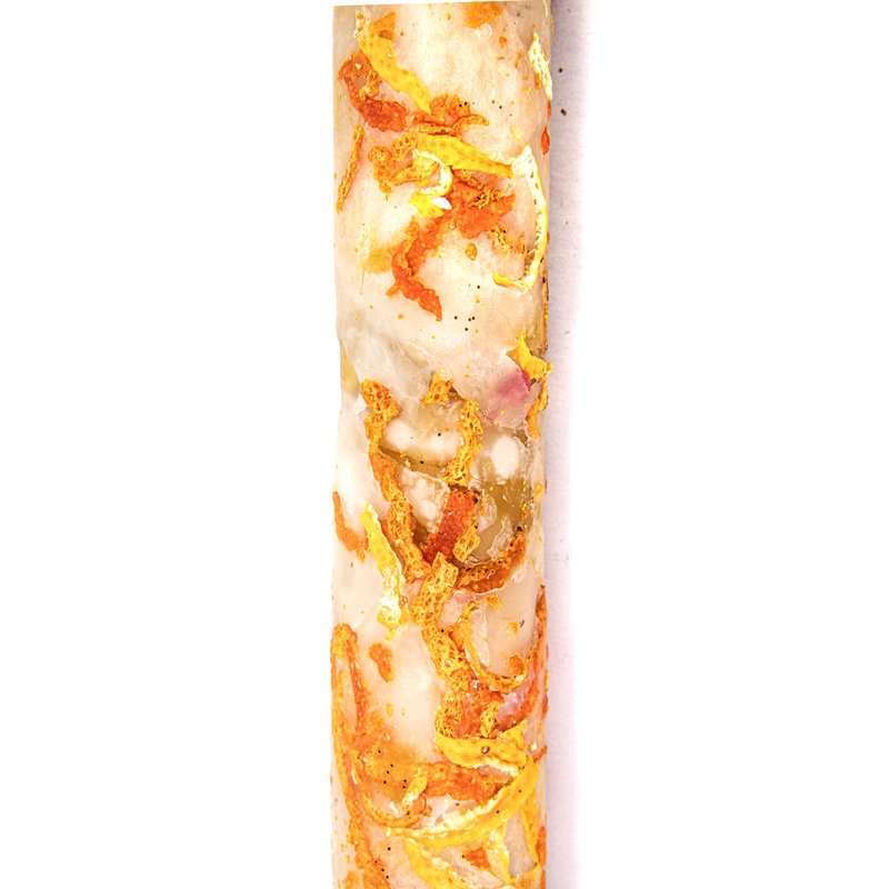 Χειροποίητη λαμπάδα από μίξη αγνού, ακατέργαστου φυσικού, κίτρινου και λευκού κεριού μέλισσας, διακοσμημένο με αποξηραμένες φλούδες εσπεριδοειδών και διακριτικές λεπτομέρειες με χρυσόσκονη.