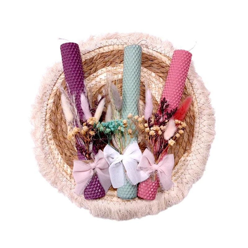 Χειροποίητες λαμπάδες 26 εκ. από μελισσοκέρι με λουλούδια σε τρία χρώματα για να διαλέξετε αυτό που σας αρέσει.