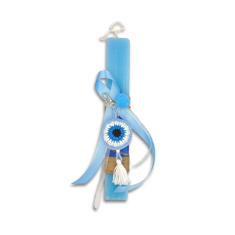 Αρωματική λαμπάδα γαλάζια 26 εκ με πλεκτό γαλάζιο ματάκι! Το ματάκι έχει γαντζάκι για να μπορείς να το κρεμάσεις όπου θες, στην κούνια, το καρότσι ή ακόμη και τα κλειδιά σου!
